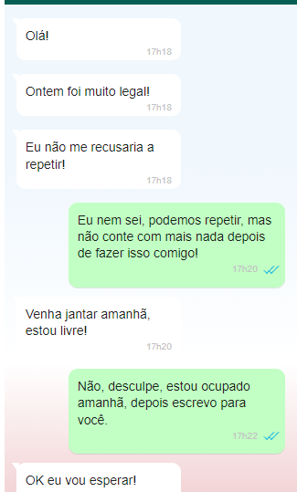 Em nosso próximo encontro, eu disse-lhe que só podíamos continuar amigos. Após a separação, eu não tinha intenção de desistir de nada, então me registrei em um site de namoro. Agora conheço garotas periodicamente, e minha vida sexual é ótima – não tive nenhum problema na cama!